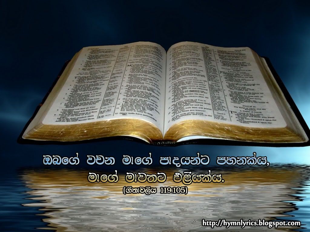 ලෝකාග්ර දෙවිඳුනි.. අපගේ පියාණෙනි.. මැවිල්ලේ කතුවර ඔබයි.. තේජස් මහිම වේ.. ප්රශංසාව මැද වැඩ සිටිනා.. පුදනට එතුමන් වටිනා.. අමිල ලෙයින් අපව මිළදී ගත්තා.. නමදිමු සැමදා සැවොමා..